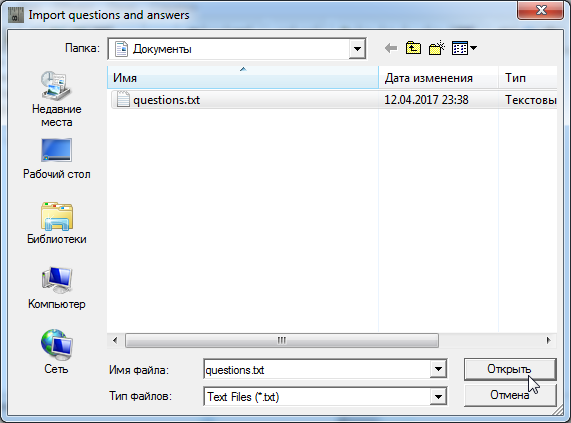 В окне «Импорт вопросов и ответов» найдите и выберите файл со списком вопросов, созданный ранее. Нажмите кнопку «Открыть» для подтверждения выбора файла.