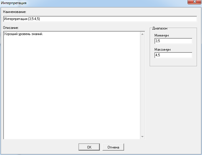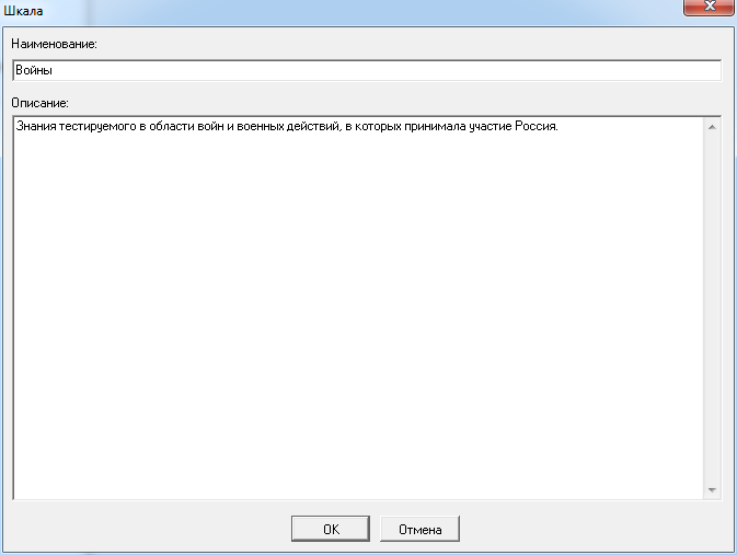 Выделите узел «Шкалы и интерпретации» в некотором тесте на дереве узлов Конструктора тестов и активируйте главное меню «Объект → Создать шкалу».