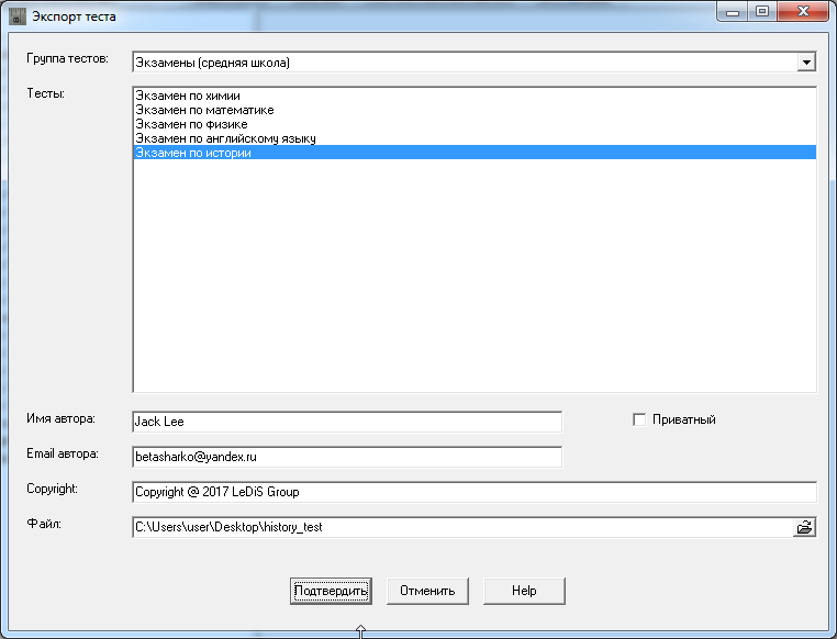 Запуск процедуры приводит к появлению окна «Экспорт теста».