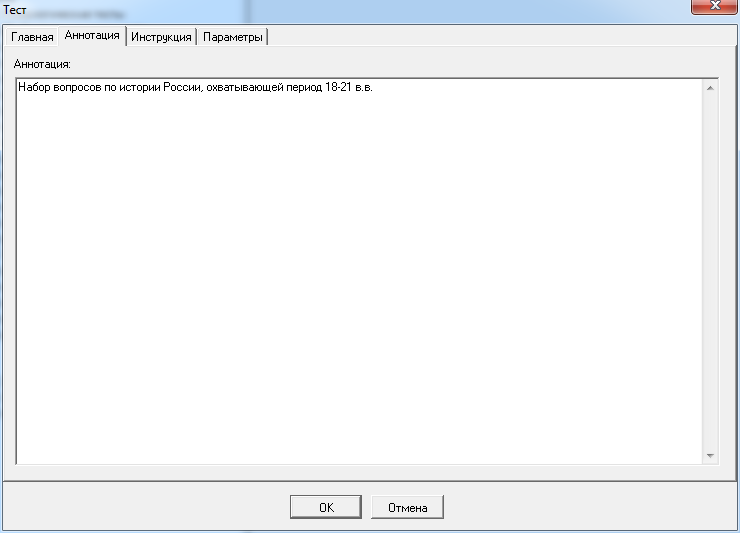 На вкладке «Аннотация» в поле «Аннотация» укажите специфическую информацию, относящуюся к данному тесту. Аннотация теста используется пользователем лишь в справочных целях.