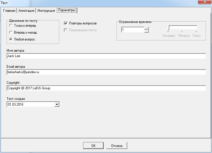 Введите свое имя в поле «Имя автора», чтобы Ваше имя было показано при запуске данного теста на сайте ledisgroup.com.