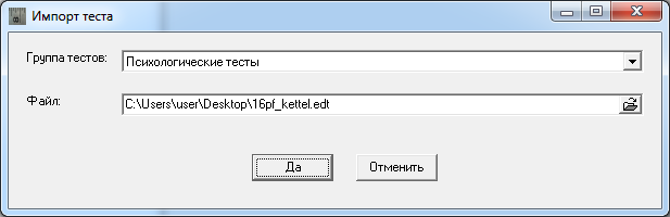 Для удобного выбора файла воспользуйтесь дополнительным диалогом «Импорт теста», для чего нажмите на кнопку