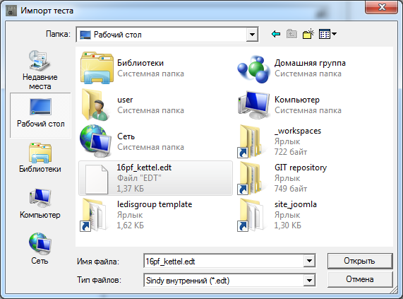 Для выбора файла импорта теста укажите его наименование в строке «Имя файла». Здесь можно ввести полный путь к имени файла или воспользоваться элементом падающего списка «Папка», а также кнопками «Недавние места», «Рабочий стол», «Библиотеки», «Компьютер» или «Сеть» для уточнения пути к файлу. Элемент падающего списка «Тип файлов» позволяет установить или отменить фильтрацию файлов по стандартному расширению файлов для проектов Sindy.