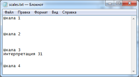 Для этого сначала необходимо подготовить текстовый файл, в котором каждая шкала и интерпретация содержатся на отдельной строке текста. При этом первой в списке всегда идет шкала, а все остальные строки до ближайшей пустой строки считаются ее интерпретациями. Группу из шкалы и ее интерпретаций можно разделять любым числом пустых строк, но хотя бы одна такая должна обязательно присутствовать.