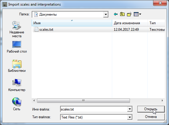 В окне «Импорт шкал и интерпретаций» найдите и выберите файл со списком шкал, созданный ранее. Нажмите кнопку «Открыть» для подтверждения выбора файла.