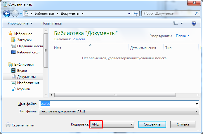 Сохраним данные в файле «scales.txt». При этом выберем кодировку ANSI.