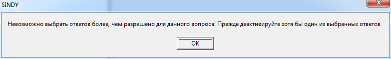 Но если при этом для текущего вопроса в группе «Многозначность выбора ответов» было указано в поле «Максимальное число ответов» значение, равное числу уже выбранных ответов, то каждый последующий выбор ответа будет приводить к появлению сообщения следующего вида: