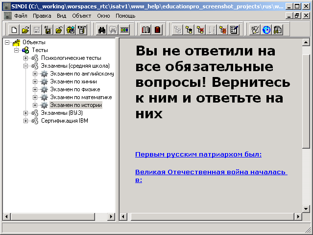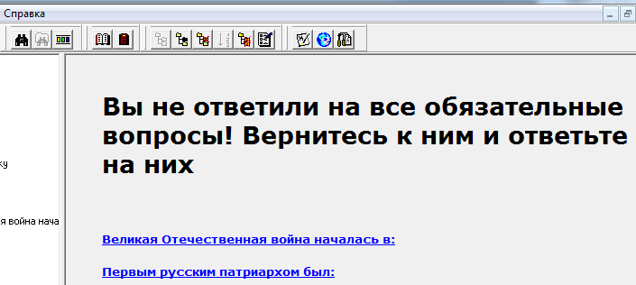 Если в ходе тестирования в текущем тесте не были даны ответы на вопросы с обязательными ответами, то выводятся сообщение «Вы не ответили на все обязательные вопросы! Вернитесь к ним и ответьте на них». Под этим сообщением выводится список ссылок на эти вопросы. В этом случае для успешного завершения теста требуется перейти к каждому из этих вопросов (это можно сделать кликом левой кнопки мыши на ссылке) и указать ответы.