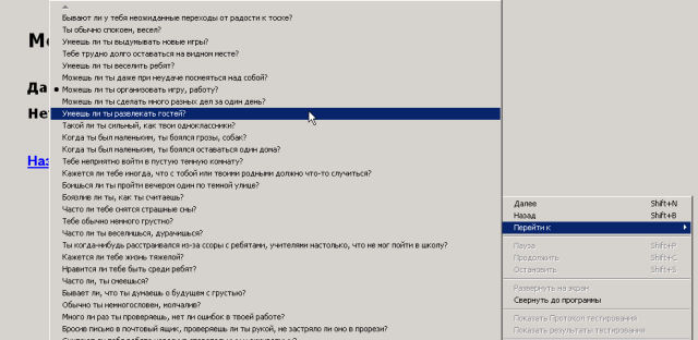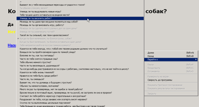 Для прямого перехода к любому вопросу теста используйте контекстное меню «Перейти к → <наименование вопроса>”