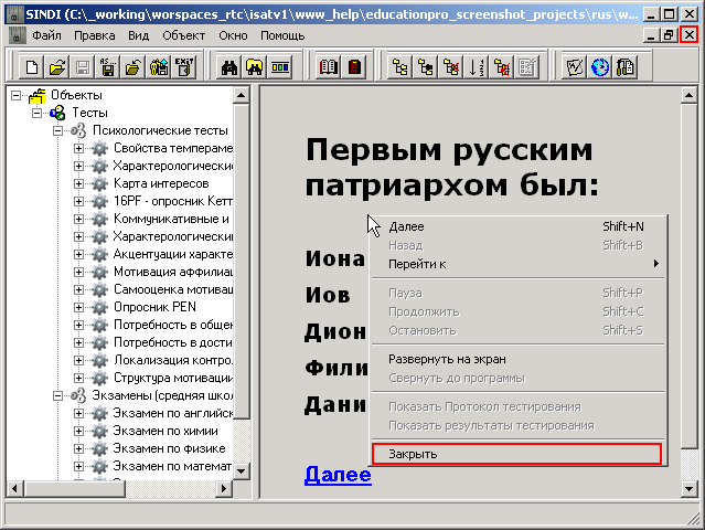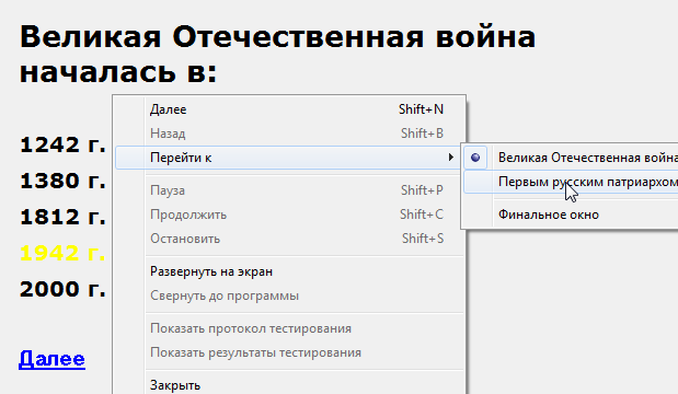 Используйте контекстное меню дочернего окна теста «Далее».