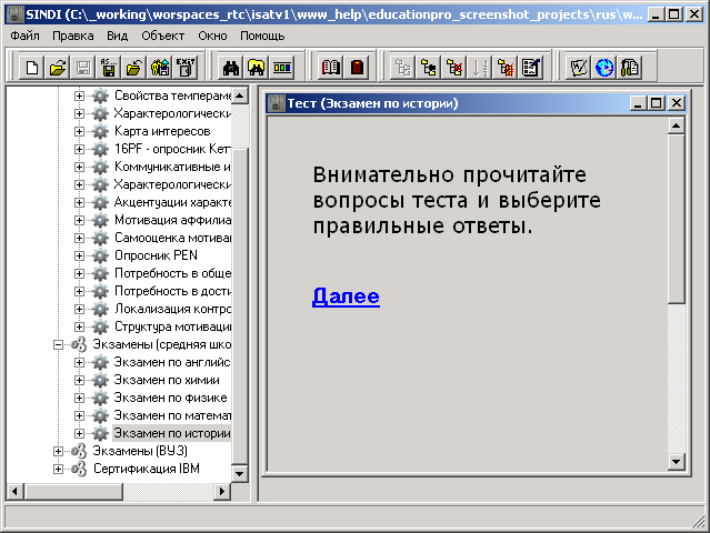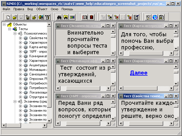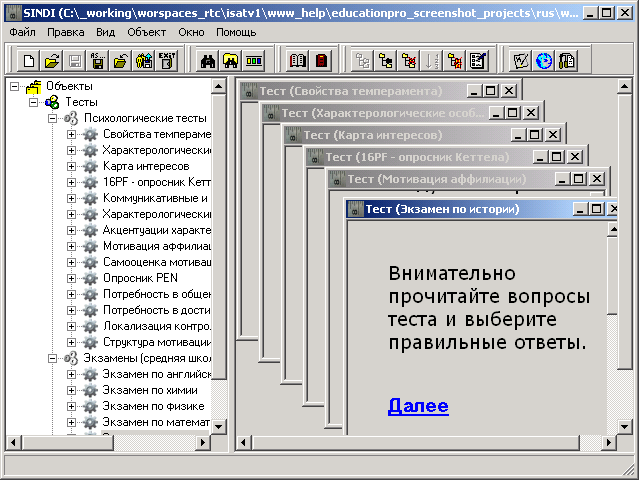 Когда в программе одновременно запущено несколько тестов, то достаточно удобным становится управлять дочерними окнами с помощью главного меню «Окно». Используйте пункт главного меню «Окно → Каскадом» для каскадного размещения дочерних окон.