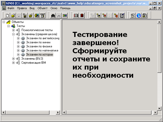 Если все обязательные ответы в тесте были даны, то выводится сообщение «Тестирование завершено! Сформируйте отчеты и сохраните их при необходимости». Кроме того, становятся доступными пункты контекстного меню получения результирующих отчетов: «Протокола тестирования» и «Отчета по результатам тестирования».
