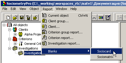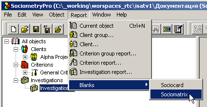 - Create sociomatrix blank with main menu “Report -> Blanks -> Sociomatrix”. In this way, input blank’s file name which this document will be saved in.