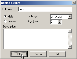 - In the window "Adding a client", input client name "John" and press OK. If you need, point sex radio button (male or female), input birthday and age.