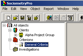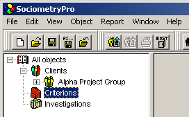 Any SociometryPro criterion is included into a criteria group. Criteria groups help to place criteria in accordance to user defined preferences. For example, you can create “Formal Criteria” or “Informal Criteria” group, “Criteria for Alpha Project” group and so on.