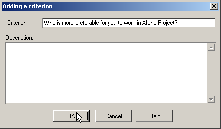 - In the window "Adding a criterion" add criterion name "Who is more preferable for you to work in Alpha Project?" and press OK.