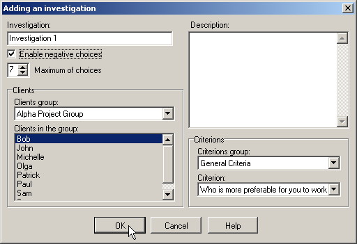 - In the window "Adding an investigation", don’t change investigation name (let it be default), set “Enable negative choices” in active status, input 4 in “Maximum of choices field”. Press OK to confirm creation of the investigation object.