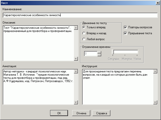 Для самого теста, а также для любого элемента теста (вопроса, ответа, веса, шкалы, интерпретации) можно указать название и описание. Непосредственно для теста также можно заполнить поля аннотации и инструкции. Инструкция выводится респонденту сразу же после запуска теста, предоставляя пояснения, как следует проходить тест. Также можно определить порядок движения по вопросам теста (только последовательно вперед, последовательно вперед и назад или свободно перемещаться по вопросам теста), разрешено ли повторять ответы на вопросы и можно ли прервать тест.
