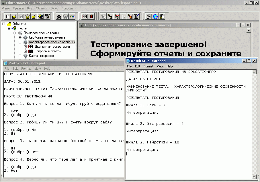 После завершения тестирования консультант может сформировать отчеты с результатами: Протокол тестирования (или листинг вопросов и ответов теста с указанием выбранных ответов) и Отчет по результатам тестирования (список шкал, результатов по шкалам и автоматически сгенерированных интерпретаций).