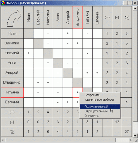 Когда исследование создано, вы можете открыть для него окно выборов. Таблица с несколькими ячейками позволяет визуально отметить выбор, сделанный членами тестируемой группы. Простой щелчок мышью — это все, что Вам нужно, чтобы указать положительный или отрицательный выбор, а также очистить содержимое ячейки.