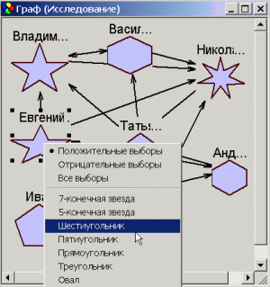 Когда Вы наводите курсор мыши на кольцо, SociometryPro отображает список клиентов с тем же количеством входящих выборов, как и число, отображаемое на кольце. Другими словами, этот список содержит имена клиентов, которые были выбраны N раз, где N — значение выбора на выделенном кольце. Это еще одна конкретная презентация социометрического исследования, которую Вы можете использовать в своей работе.