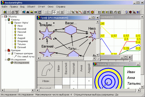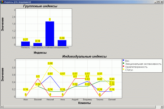 Здесь в окне отображаются все групповые и индивидуальные показатели расследования в виде графиков. Социометрические индексы представляют собой расчетные значения, полученные по результатам проведенного тестирования. Они смогут продемонстрировать Вам особенности группы участников. На их основе Вы можете получить необходимые знания о группе и предпринять адекватные действия, если на Ваш взгляд они могут помочь людям, с которыми Вы взаимодействуете.